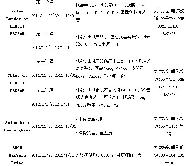 礼遇1:于2011年11月25日至2012年1月31日,凭银联信用卡/借记卡于弥敦道26号商场消费达港币3,000元或以上,即可换领价值港币100元新地商场现金礼券。礼品数量有限,换完即止。