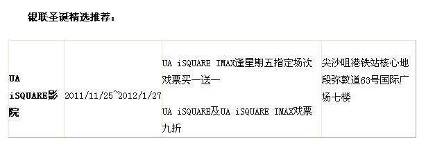 1. 9折优惠只适用于2011年11月25日至2012年1月31日于UA iSQUARE及UA iSQUARE IMAX影院放映的电影场次。