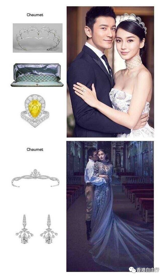 晓明为了让Baby能像公主般出嫁,继价值千万的6卡Chaumet冠冕婚戒之后,黄晓明再请创建于1780年,曾为法国王后制作珠宝的Chaumet出手,为Baby打造一顶价值连城的皇冠,让Baby在婚宴上佩戴,让老婆可以像童话公主嫁王子般出嫁。婚礼上Baby亦佩戴Chaumet的高级珠宝系列,再化为高贵典雅的王后。