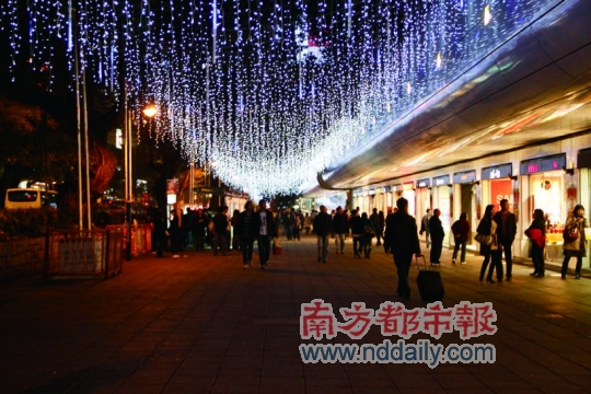 九龙公园旁的柏丽购物大道简直就是一条“星光”大道。仰起头,在香港鳞次栉比的高楼中能看到星空,是多么浪漫的感觉,虽然这是用灯光佯装而成的浪漫。在大道的中段,也有圣诞老人与麋鹿的灯饰在讲述有关圣诞的故事。