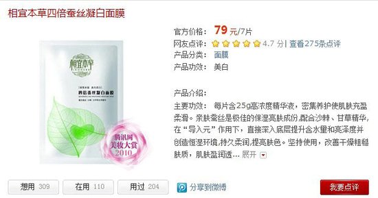 必败单品NO.4:相宜本草四倍蚕丝凝白面膜