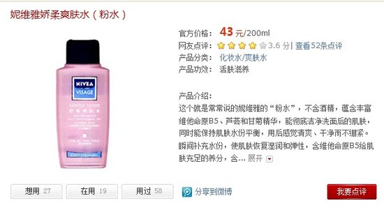必败单品NO.9:妮维雅娇柔爽肤水(粉水)