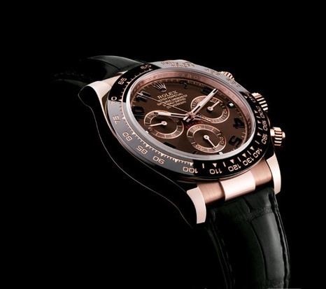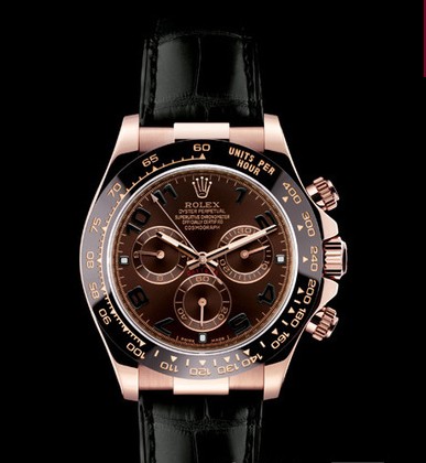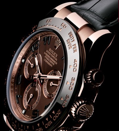 腕表配备由劳力士独家研创,采用顶级陶质制造的CERACHROM黑色字圈。这款最新字圈秉承1965年的款式设计;字圈更能防刮损、抗侵蚀及永久保持亮泽。外圈上的刻度透过PVD过程,细致镀上粉红金,使数字易于阅读。劳力士蚝式恒动宇宙计型迪通拿。