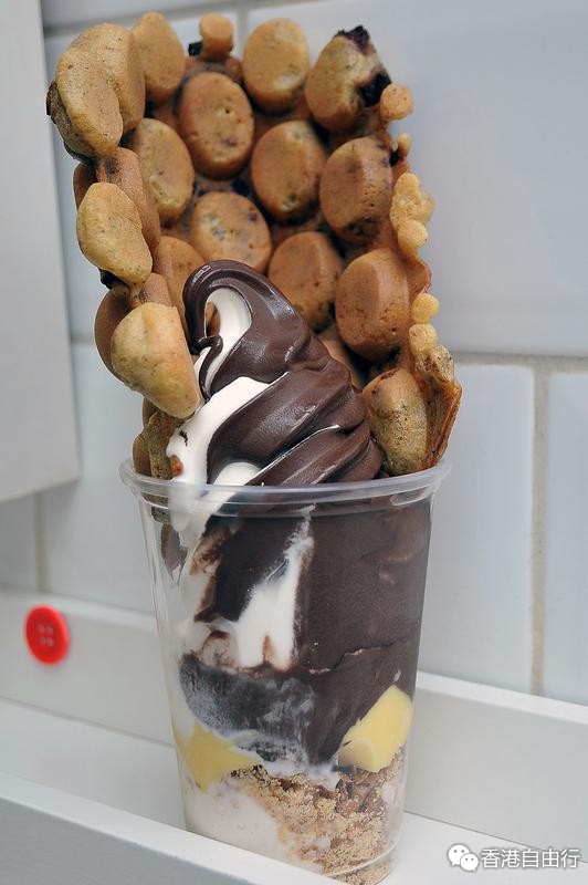 短评:鸡蛋仔口味偏硬,故很有口感,口感丰富,每吃一粒都能吃到朱古力味,不会有吃空气的感觉。用鸡蛋仔点雪糕吃又会有微微冰火的感觉。由于鸡蛋仔压着其他食材,故吃完软雪糕后,又会再遇应该先吃什么的难题。惟一是下层的材料太丰富,难以吃出焦糖香蕉雪糕的味道。
