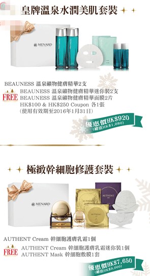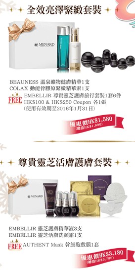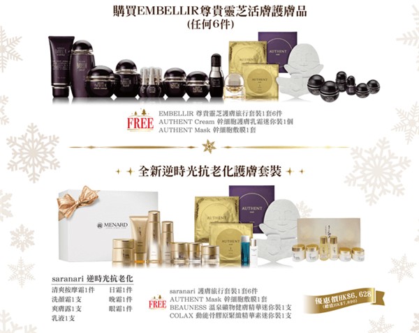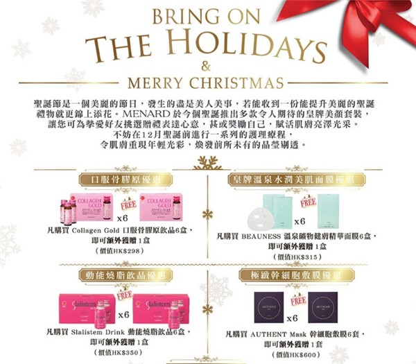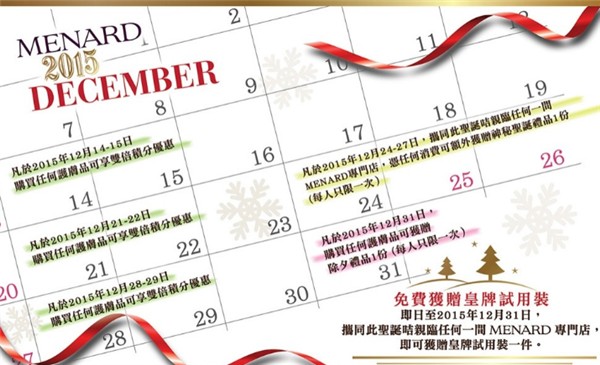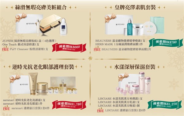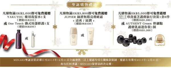 由即日起至12月31日,亲临MENARD各专门店,可享受以下圣诞套装及优惠。