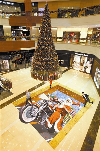 3D地画“潮爆圣诞”正在澳门壹号广场内中庭展出,最佳观赏位置在上方二层扶手一角