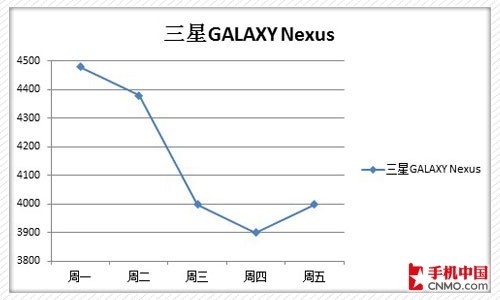 三星GALAXY Nexus是全球首款搭载Android 4.0操作系统的智能手机,全新的操控体验以及双核处理器带来的出色表现让它颇受大众喜爱。随着时间的推移,如今这款强悍智能机价格开始松动,从下面的走势图中我们就能看出。周一至周四整体呈现下跌趋势,短短几天之内蒸发掉了近600元,而周五价格开始出现小幅上扬,本周售价最终以3999元收盘。