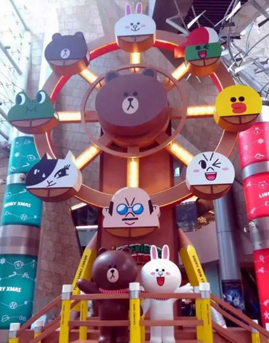 上到四楼的通天广场,这座两层高的笔刨摩天轮非常抢眼!最中间有熊大,车卡位有Boss、Brown、Jessica、小青蛙Renard、Sally、Moon、Cony和小小虫Edward。
