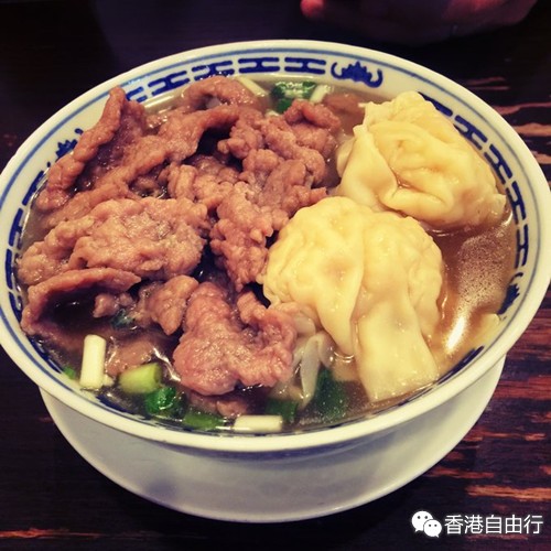 想到中环这还有另外一家朋友提过的店,前几年都是米其林一星推荐,叫沾仔记。是云吞面的地方,既然不远那肯定要吃啊,中环这总不能天天都来吧,眼看我们还剩下不到两天的时间了,于是,果断顶着刚刚吃饱的肚子找到了惠灵顿街上的那家沾仔记。半下午的时候店里人不多,装修比其他的小吃店干净整洁,刚坐下阿坚就说他吃不下,我没好意思干坐着不吃啊,那就点一份吧,要了牛肉鲜虾云吞双拼配牛河,既然只能点一份,又想尝试多个味道,那只有这这样了,我真是为了吃操碎了心,而这,是我们今天的第三顿了。