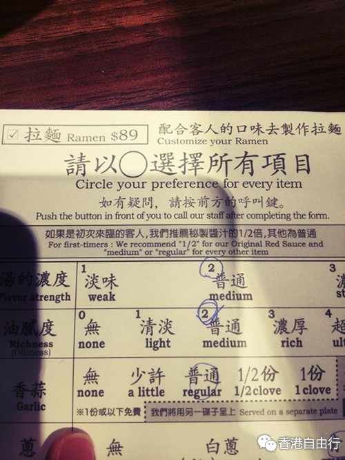 一碗面从面到汤到葱蒜之类的作料,全凭自己做主,面的软硬、汤的浓淡、油腻度、葱是要白葱还是青葱、肉片的有无、辣椒的多少等等,就像一份非常细致的餐前调查,然后根据你的喜好煮出一碗好吃的拉面。不得不说,光就这一点就很赞啊!