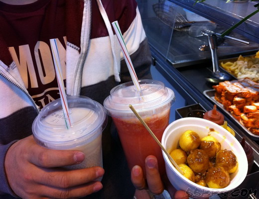 出了翠华,又发现了路边摊,来了四天了都没有尝到,虽然翠华已经吃的很饱了,那。。还是塞了一点。。。机不可失,失不再来!!! 吃了传说中的“咖喱鱼蛋、鱼肉烧麦、西米露、鲜榨西柚汁”,鱼蛋和烧麦都是HK6元一份、西米露HK7元、西柚汁HK14元,西柚汁非常的好喝,爽口!原谅我的没出息吧~~