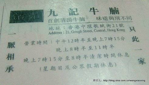 这家面馆,其实准确地说是以卖牛腩为业的小餐馆,名字叫九记牛腩,位于中环,很多中环的白领经常是中午打车去这家店吃一碗牛肉面,当然还有人是专程开着高级轿车来的,所以饭点的时候要排位才可以吃上。