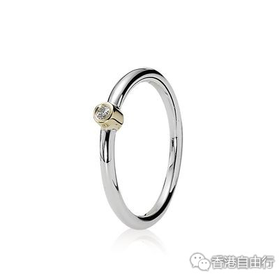 以纯银打造的精緻戒指饰上一颗闪钻,镶嵌细节由14K金製成,设计经典简单。