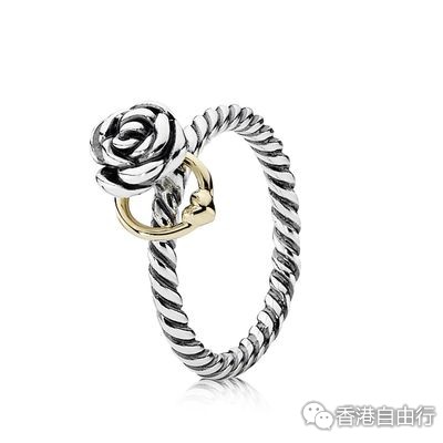 可爱迷人的戒指以扭纹为造型,上方缀以一朵经精雕细琢的玫瑰。玫瑰外围搭配一个14K金环圈,环圈带有精緻的心形细节。