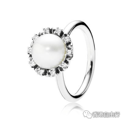 纯银戒指镶配光亮的白色淡水养殖珍珠和一圈闪烁宝石,在不同的节日庆祝都能为您的打扮注入浪漫气息。