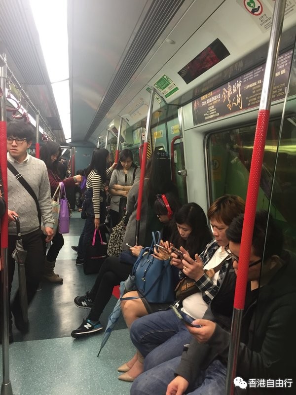 港铁还是比较小而密的,可能为了最大载客量,位子只有一排几个或者只有一边有,站的地儿最大