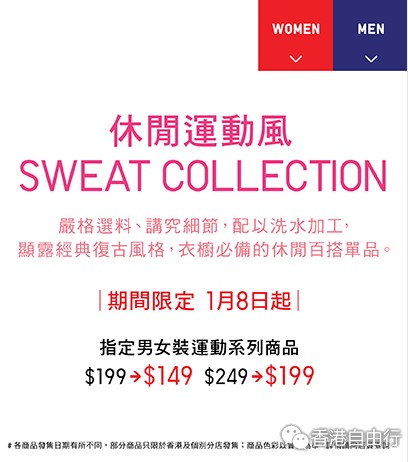 香港打折:优衣库UNIQLO指定男女装运动系列商品限定优惠(16年1月8日起)