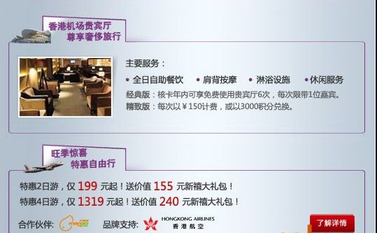 除以上三重优惠外,还可享受机票购买优惠及机场贵宾厅待遇,过年去香港一定记得刷招行信用卡!