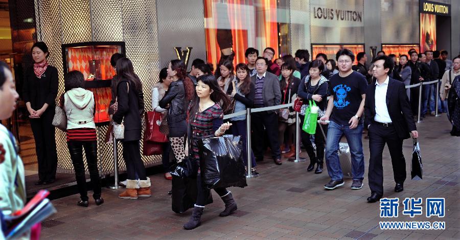 12月29日,游客在一家名牌商铺前排队购物。 2012年元旦和春节临近,来自世界各地的旅客涌进香港,掀起又一轮旅游购物热潮。截至12月21日,2011年抵港旅客人数已突破4000万人次