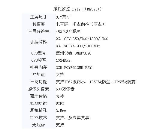 摩托罗拉ME525+几乎延续了ME525的外观造型,整机依旧时尚。该机正面为一块3.7英寸TFT材质的电容屏,支持多点触控,分辨率达到480×854像素。系统上,该机搭载了Android OS 2.3的操作系统,可玩性更高,处理器主频升至1GHz,性能也比前作提升不少。除此之外,该机还配备了一枚500万像素的摄像头,蓝牙、重力感应、WIFI等功能也一应俱全。