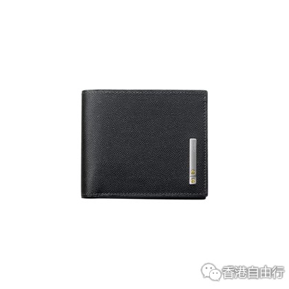 黑色粒面牛皮摺叠皮夹,可容纳6张信用卡,配色衬里,镀钯及镀金螺丝装饰。
