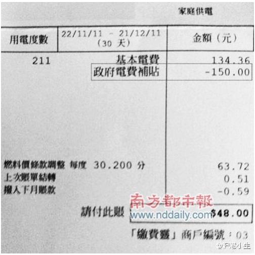 发自香港 一个港人家庭每天都开2000瓦功率的暖气,每个月电费只交48港元,电力公司并没有算错账,因为港府每月补贴电费150元。近日,一个港人家庭的电费单在微博上引起不小轰动,引来不少网民的转发和热议,内地网民对此羡慕不已。
