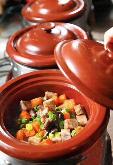店铺本身是紫砂煮食电器生产商,05年开设饭店,店内大部分食物都是以紫砂电器烹调而成,又以煲仔饭作主打。紫砂煲的最大特色是含天然丰富物质及耐热耐酸,当中的放射远红外线有助提升食物味道,用它来做煲仔饭,米饭亦不带半点油腻,最适合怕胖的女士。煲仔饭以600 w热度烹调,店铺对米饭亦颇讲究。为了令口感更好,师傅以10:1的白米跟糯米来做煲仔饭,生米放水后,置于饭煲内煮近10分钟,待饭煲发出“咇咇”的响声后再放入材料多煮10分钟。由于全部以电子控制,所以一次过烹调十多煲都不成问题。至于饭焦,都是靠热力抽干米饭的水份而造成,即使没有明火烧的香味,却能做出同样香脆的口感。店内共有廿多款口味,除了传统配搭,亦可找到新颖口味,如黑椒滑牛、黑椒鸡粒等,口味走家庭小菜路线。