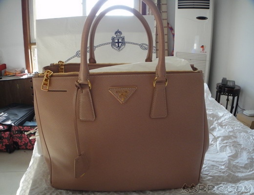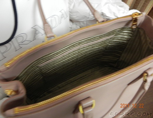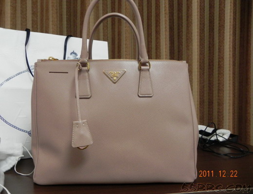 进了Prada, 店员很热情的招待了LZ, LZ本来是奔着褶皱小羊皮去的,虽然Prada的尼龙布有历史而且很经典,但是LZ和LG都还是倾向于皮质,可是海港城的那家店的褶皱小羊皮只有三个经典颜色, 黑色,卡其和灰色, 楼主都不是很喜欢, 价格好像是HKD21,000左右, 其实尼龙有个蓝灰色的颜色,价格在HKD8000左右,LZ倒是很喜欢,觉得还耐脏,但是对材质犹豫 啊。。。店员看LZ犹豫不绝,就推荐了这款Saffiano系列, 也是经典款,LZ最初也考虑过这款,颜色楼主真的是很喜欢,有人说是粉色,有人说是烟灰色, 反正这个颜色正适合楼主,不会太嫩也不会太老。。。但是当时是考虑中间没有拉链啊。。。很容易被偷。。呵呵LZ总是不太喜欢提中间没拉链或者没按扣的包包, LZ是个丢三拉四又不太注意的人, 这样很容易丢的。。。可是店员说,旁边有两个拉链,可以往旁边两个袋子装,然后包包是往中间鼓的,这样不会影响包包的形状啦。。。LZ恍然大悟啊。。。有道理有道理, 解决了这个问题,当时就拍定是这个啦, 后来又纠结大小两款啦。。。呵呵,LZ总是纠结啊纠结。。。这个小号的有肩带,背着很漂亮,大号的就只能手提啦, 其实size差别还是挺大的,但是价格差不多, 之前有个MM也问到,好像小号的确实是HKD15,000左右,但是LZ喜欢肩带啊肩带。。。LG认定大号的,觉得大号比小号的值。。。呵呵, LG喜欢简单大方的款, 这个包包LG一看到,就喜欢啦。。。正好也帮了LZ纠结的忙。。。LZ拍板啦,就买这个啦。。。