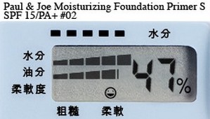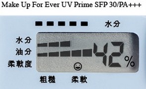 2/ 用肌肤水分测试器,测试和对比使用妆前底霜前后的水分指数,以计算出保湿度。使用妆前底霜前,肌肤水分指数为32%。