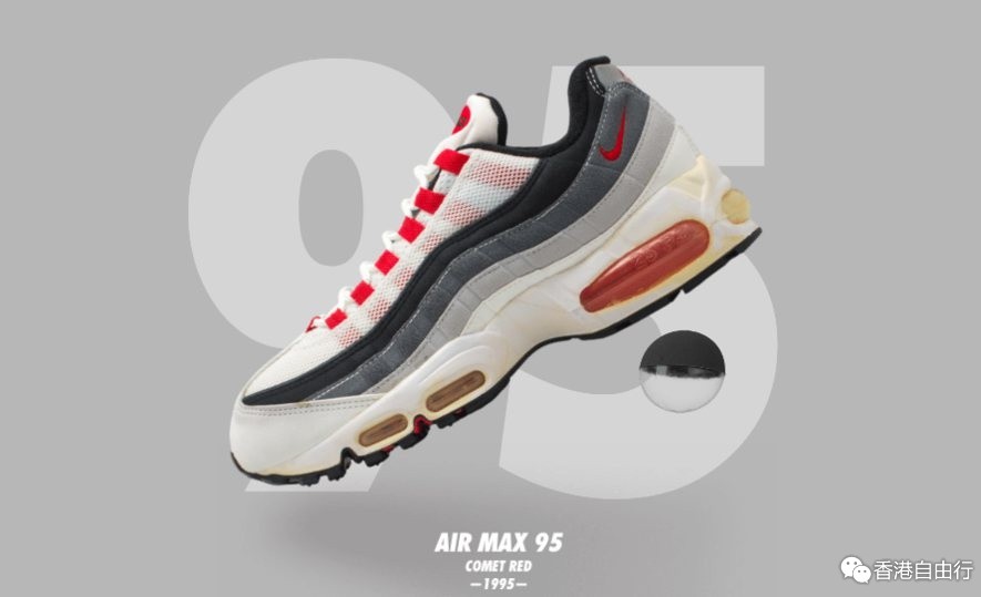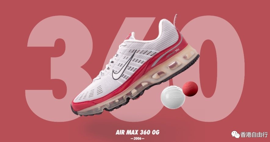 以全新模具打造的 Air Max 360 是第一款采用 360 度 Nike Air 可视气垫的运动鞋。这款鞋的首个配色是向 Air Max 1 致敬,同时配以与 Air Max 95 相似的激光穿孔设计。