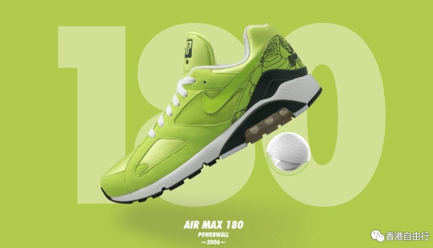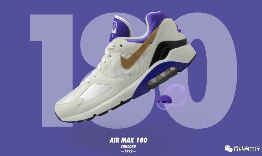 1991年发布的Air Max 180是公认的第一双采用180度Nike Air可视气垫缓震技术的运动鞋。这款继Air Max Light之後发布的鞋款也是第一双将聚氨酯外底与 Air-Sole 气垫单元直接黏合的鞋子。