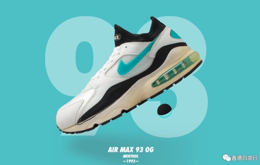 由Tinker Hatfield设计的Air Max 93因其两大特徵而闻名:包裹脚部的氯丁橡胶内衬和首次应用的270度吹塑成型Nike Air气垫。白色、薄荷色与黑色混搭的配色方案也令人耳目一新。