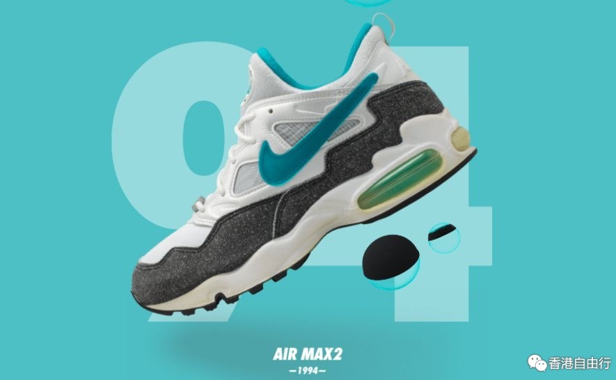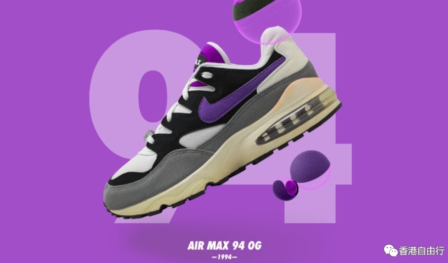 1994年发布的Air Max 94被认为是第一双采用全长PU双重压力鞋跟气垫的运动鞋。Air Max 94凭藉其创新的缓震配置为Nike跑鞋的未来发展提供了方向。
