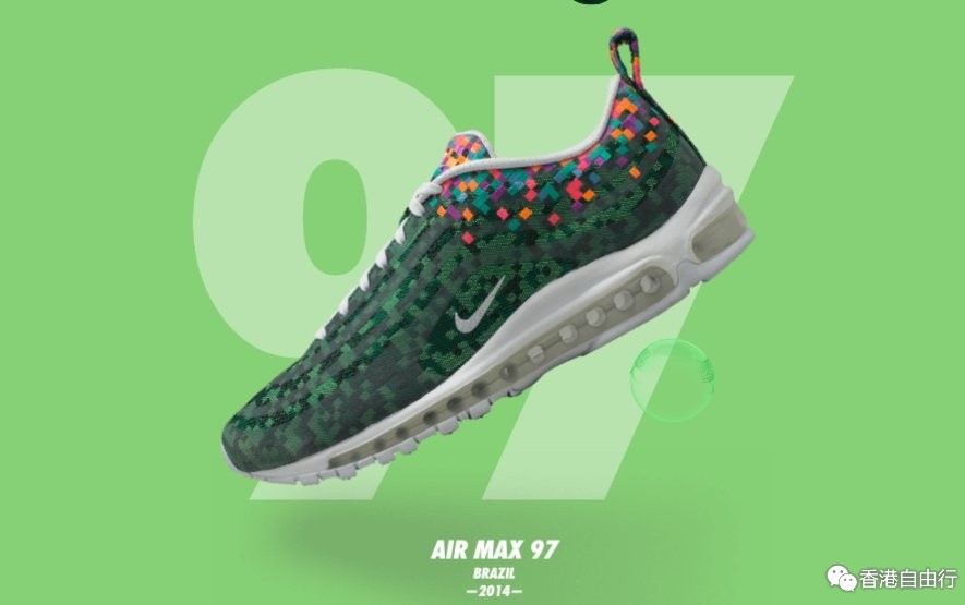 为了庆祝最盛大的足球盛事,随系列推出的Air Max 97 Brazil主要展现了巴西国家和其两座主要城市的风采:里约热内卢和圣保罗。以绿色为主的鞋面,在彩色马赛克图案的映衬下,向巴西美丽的自然风光和富有活力的文化氛围致敬。