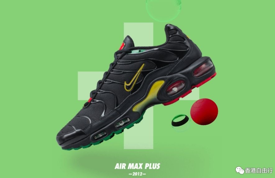 於2012年欧洲独家发售的 Air Max Plus 以黑色鞋身搭配绿色与黄色的鞋底渐层设计,独特的双色鞋底配色与销售方式让这款 Air Max 增添了稀有度以及不同的个性。
