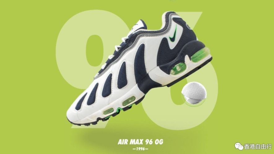很难对1996年推出的任何一款 Air Max 缓震运动鞋有所非议。这一年的旗舰跑鞋与其他鞋子并无二致。这款 Air Max 96 采用凭藉精妙的绿色细节点缀和网眼布内侧的反光设计,Air Max 96难以被忽略。