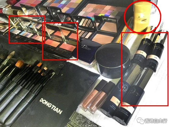 兰蔻、YSL、CPB、Dior等大牌美妆品整齐排列在桌上。