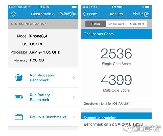 既然说到配置,就不能免俗跑个分,当然这也只是侧面的一个参考。通过GeekBench跑分,iPhone SE的单核心以及多核心分数都略高于iPhone 6s,不过高出的并不算很多,可以认为二者的分值几乎是一样的。其实略高一点也可以理解,毕竟iPhone SE相比iPhone 6s较低的分辨率,在跑分上会占有一定优势。不过iPhone SE相比iPhone 6来说占有2000元的价差优势,核心性能却几乎一样,这部分对于用户来说是超值的。