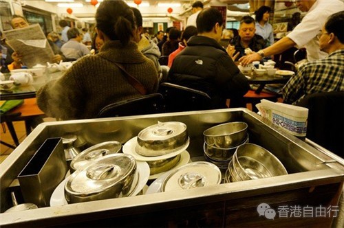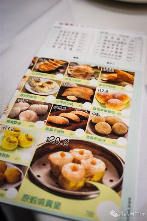 自己用茶水洗餐具,就等着点心车了。点心是由上了年纪的阿姨推车出来送的,一拨一拨被拿光就再推回去。上来的点心也没有任何顺序可言。桌上有点餐纸,每取一样,就帮你在相应的地方搭个小印章,走的时候一起算钱。几轮下来我们发现可不能坐着等,大多热门的东西没等到我们的位子就没有了,所以吃到一半我们就学会抢到前面去取。