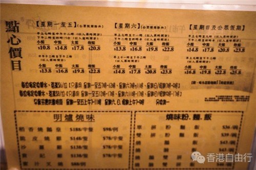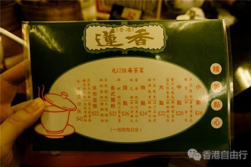 桌上的点心价目,好小一张纸便写清了每周七天的价格。越是平时越是上午,优惠力度越大。酒店工作日的茶点,每件比周末要便宜2-4元港币。除此,还有非常超值的特餐,比如不到20港币,就可以吃上凤爪饭配一件点心,也难怪点这个套餐的阿伯阿妈很多。不过早起就要吃米饭,对我的胃口而言实在有些吃力,看看也就好了。
