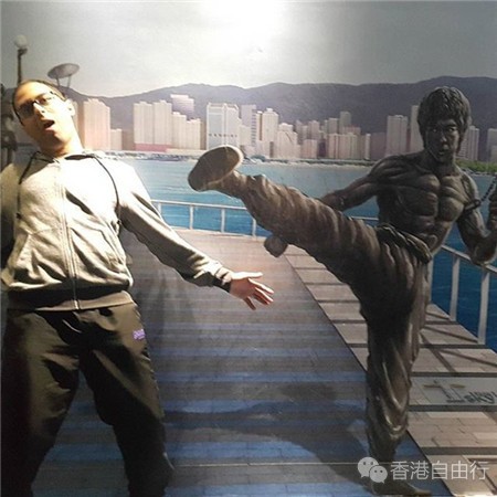 “香港奇趣3D大街”以象征港人精神的李小龙为主题,这位游客的演技我给100分,模仿被飞踢挺搞笑的。