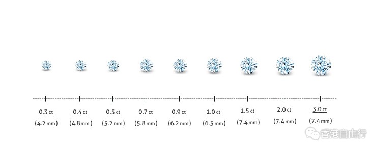 在其他三c相同情况下,钻石价格与重量平方成正比,重量越大,价值越高。钻石重量是以克拉为单位的。1克拉(ct)=0.2克(g)。把一克拉平均分成一百份,每一份是一分,商场价签上标的0.3ct,0.4ct就是所说30分40分.重量也有级别之分,0.30ct-0.39ct,0.40ct- 0.49ct,0.50ct-0.69ct,0.70-0.89ct,0.90-0.99ct,1.00ct-1.50ct,1.50-2.00ct(每一级别分别由逗号隔开,不是一个级别的,就算差一分,价格也会相差很多,这就是为什么象 0.48~0.49,0.68~0.69,0.88~0.89......会很难买到的原因)