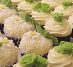 Jennifer 喜欢清雅高贵的 cupcake 创作,例如粉绿与纯白的设计主题,一个粉绿玫瑰衬忌廉,另一个是白色雏菊衬粉绿蝴蝶,蛋糕是云呢拿和椰子味。Cupcake Tower 以绿丝带围边衬托,充满清新跳跃动感。