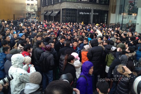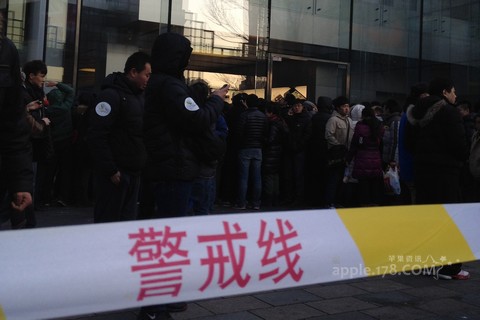即使在首发当日的中午,警察在多次清场,并且划出两道警戒线后,围观人群依然紧紧围绕在苹果店附近,形成对峙之势。甚至期间多次引发双方冲突。