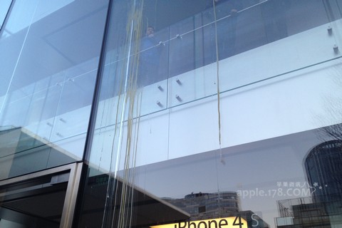 两颗鸡蛋砸在苹果店玻璃围墙上