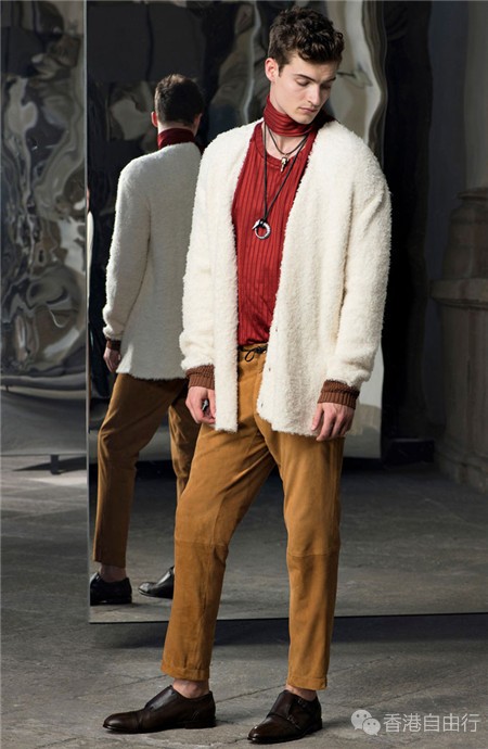 面料的选择更突显了这种对立,氯丁橡胶与雅亚麻,丹宁与麂皮——冲突与融合,突破了传统的束缚,创作出新的和谐。色彩的应用亦是如此:各种相近的颜色过渡融合,没有绝对界限,在混乱统一中达到了更加现代的和谐。