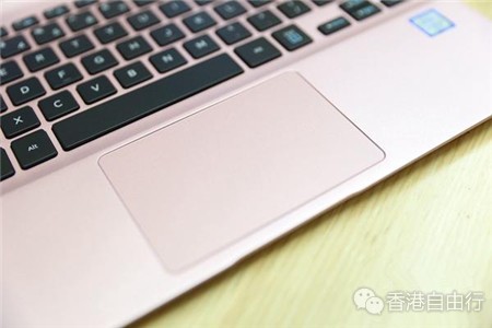 值得一说的是,NoteBook 9的键盘是带有背光的,包括关闭、低亮、中亮、高亮4档调节。而且它的背光并不是我们常见的白色或者纯蓝色、纯红色,它的背光颜色是水粉颜料里的粉绿色,不但体现出与众不同的感觉,而且与粉色机身和银色机身搭配都是非常和谐的颜色。