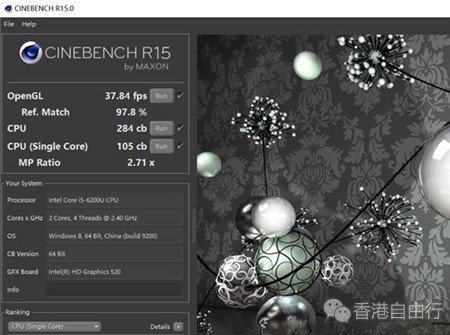 第一项测试是CINEBENCH R15,这是一款业界公认的通用测试软件,能够较为准确的衡量CPU的处理性能,通过测试,我们看到这款NoteBook 9在该测试项目中多核得分为284分,单核得分为105分,整体表现基本满足i5-6200U的平均表现。