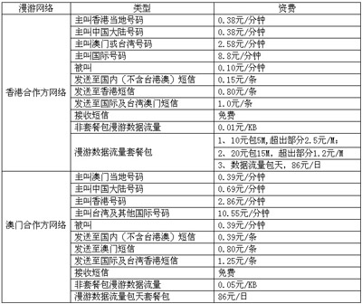 用户漫游至合作方网络使用副号码时,具体资费: