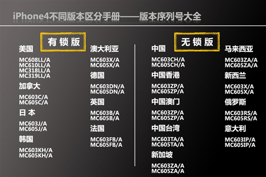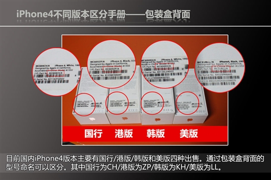 目前国内iPhone 4版本主要有国行/港版/韩版和美版四种版本出售,通过包装盒背面的型号命名可以区分,其中国行为CH、港行为ZP、韩版为KH、美版为LL。